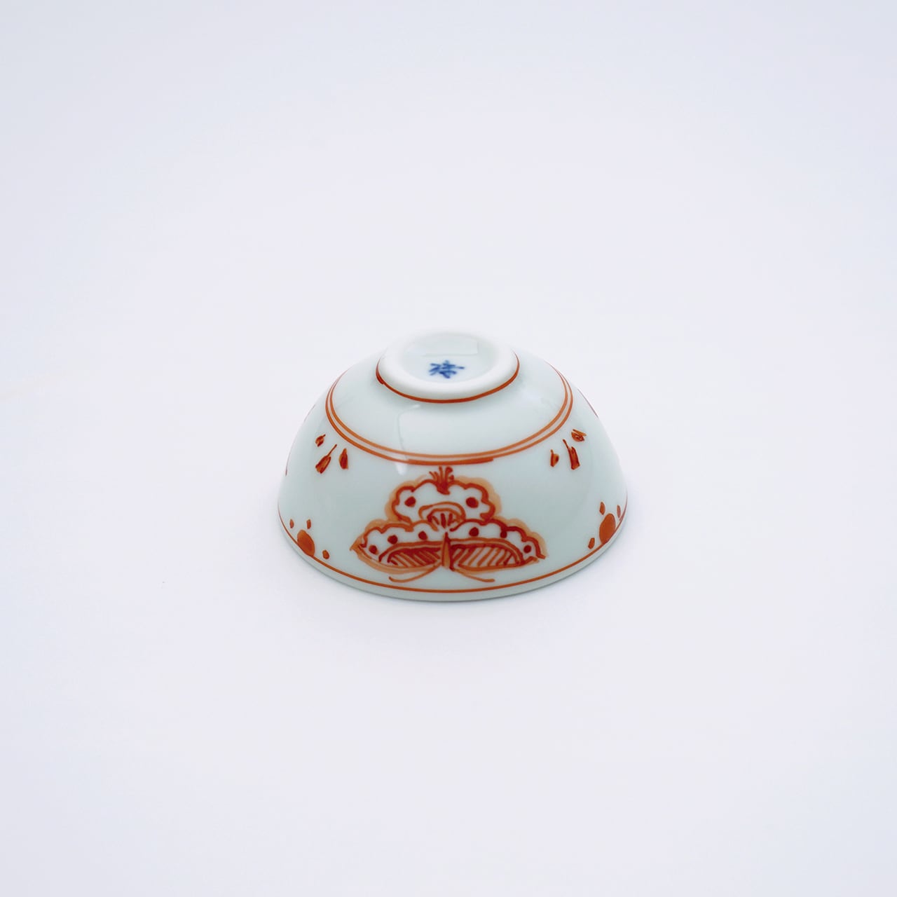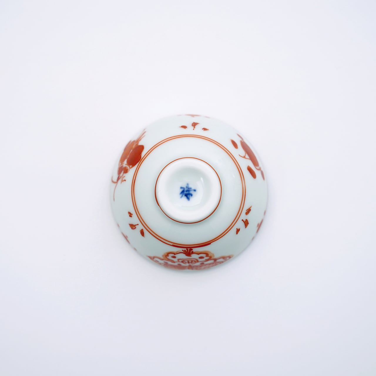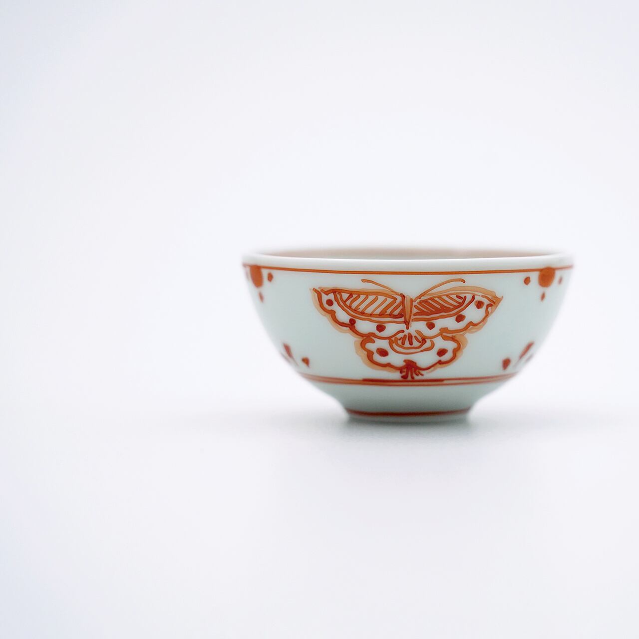 赤絵で華やかに花蝶をデザインにした「朱彩花蝶」の茶杯(ちゃはい)です。中国茶をお楽しみいただくときにご使用できる杯です。
