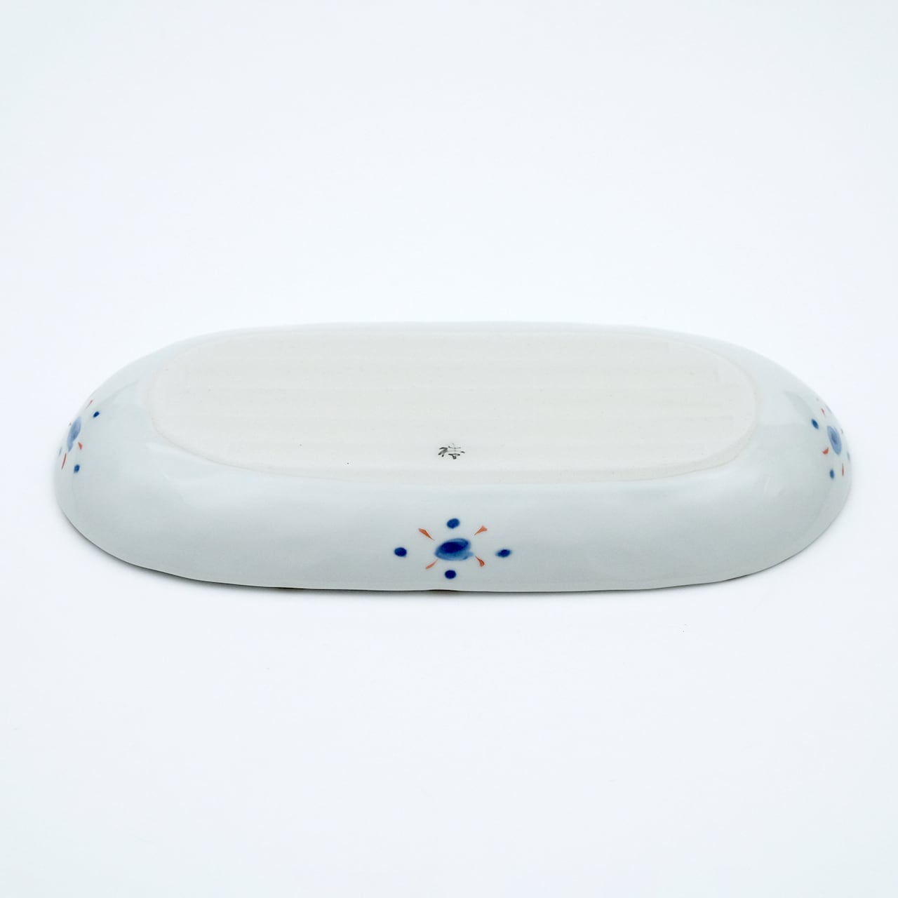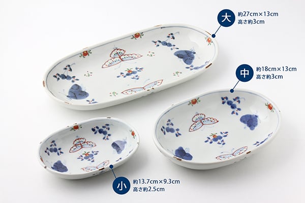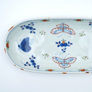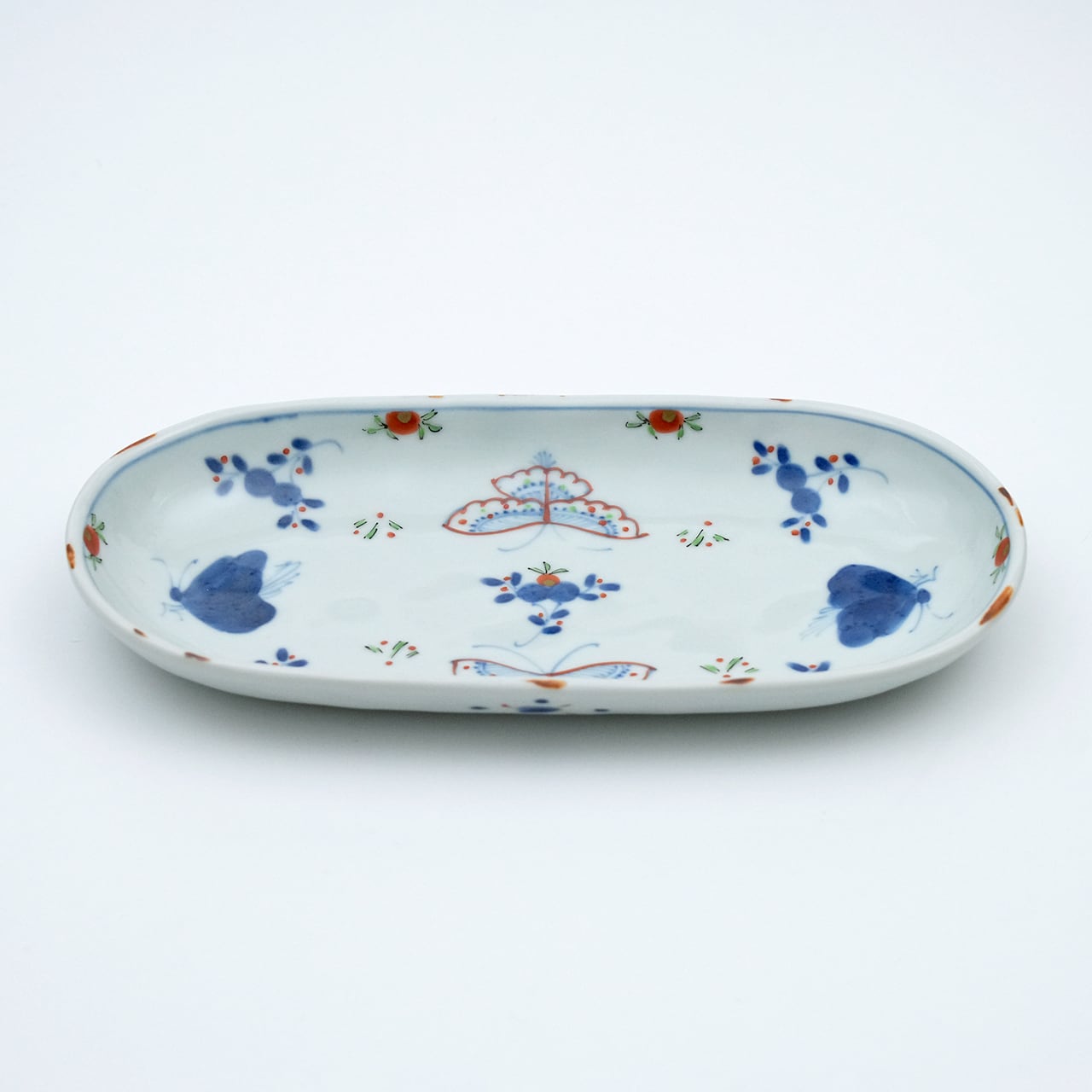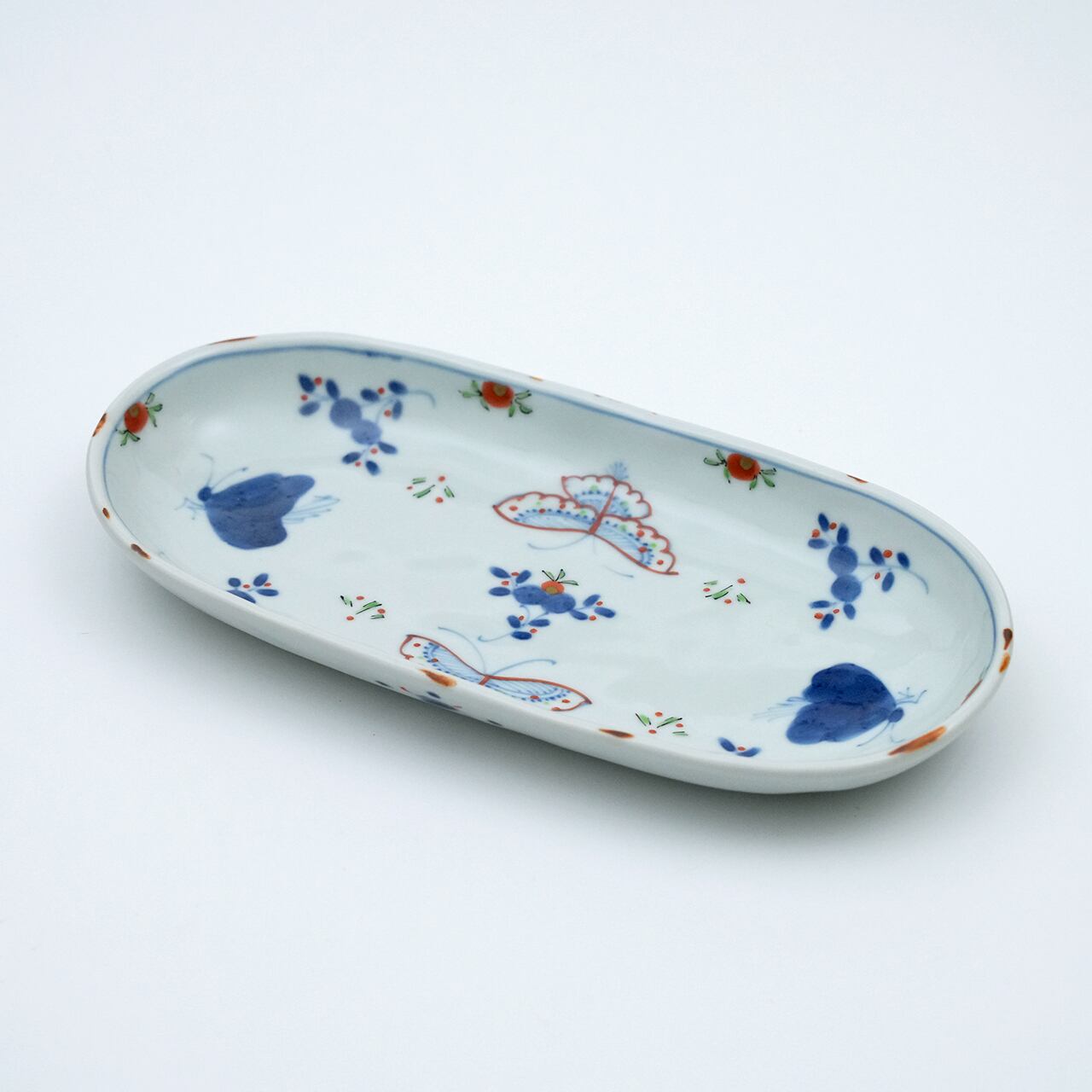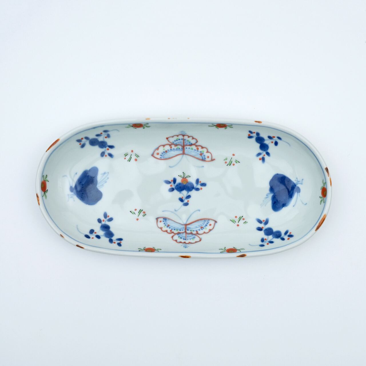 有田焼窯元・福珠窯の定番人気シリーズ「天啓赤絵花蝶文」の小判皿です。 中国の明末・天啓時代に焼かれた赤絵のやきものに倣い1983年から製作されている絵柄です。30年以上たった今でも非常に人気の高いシリーズです。
