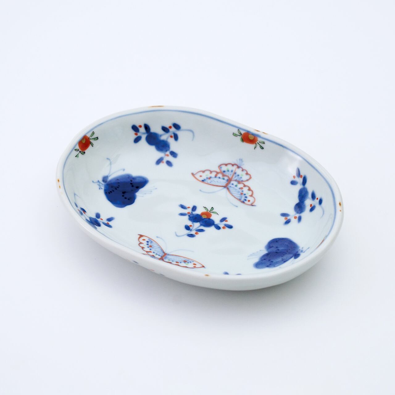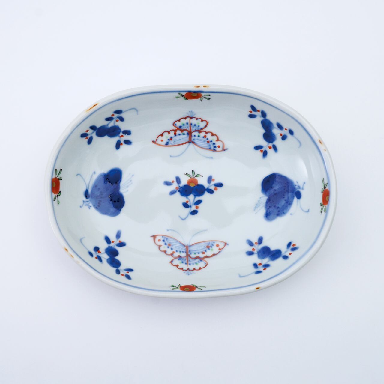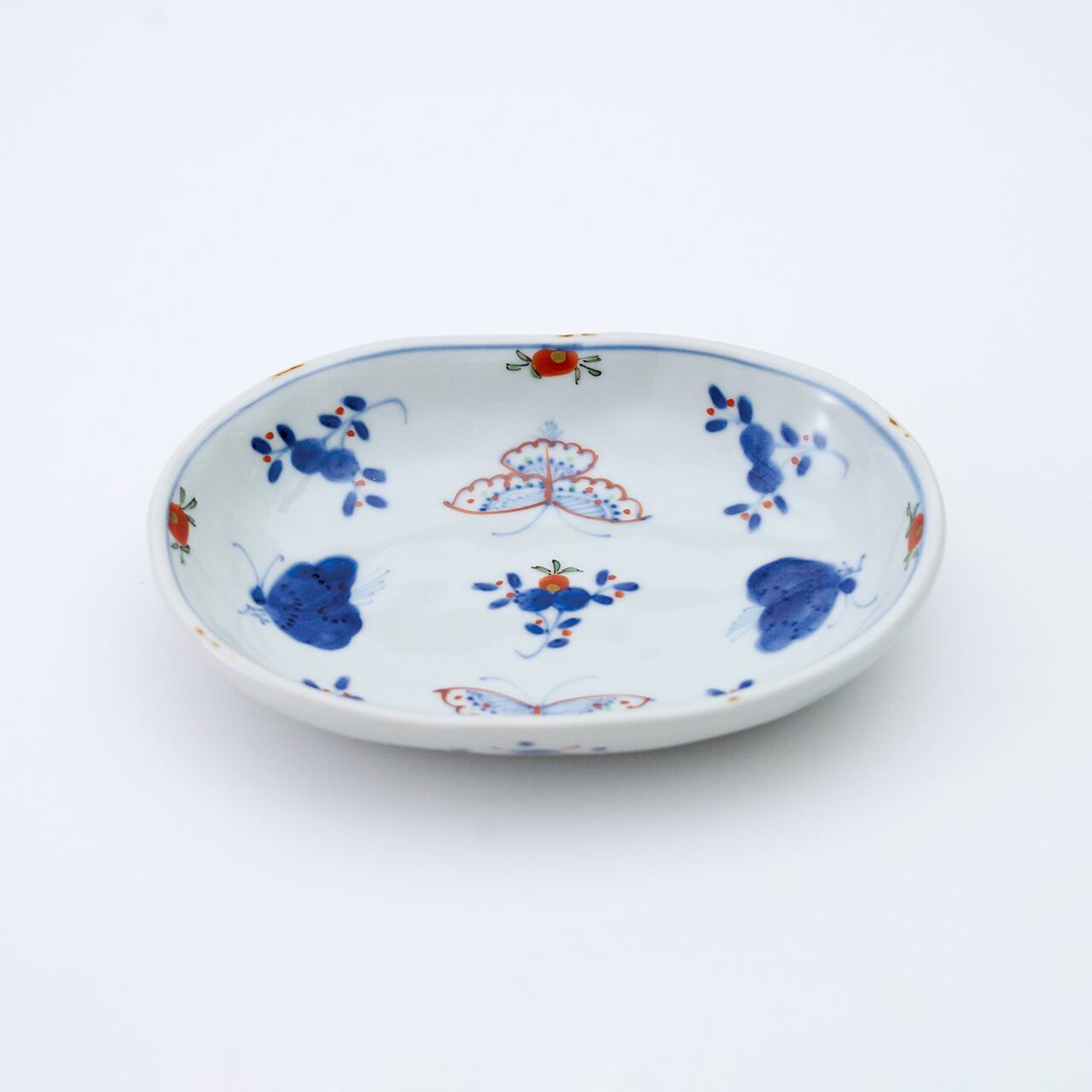 有田焼窯元・福珠窯の定番人気シリーズ「天啓赤絵花蝶文」の小判皿です。 中国の明末・天啓時代に焼かれた赤絵のやきものに倣い1983年から製作されている絵柄です。30年以上たった今でも非常に人気の高いシリーズです。