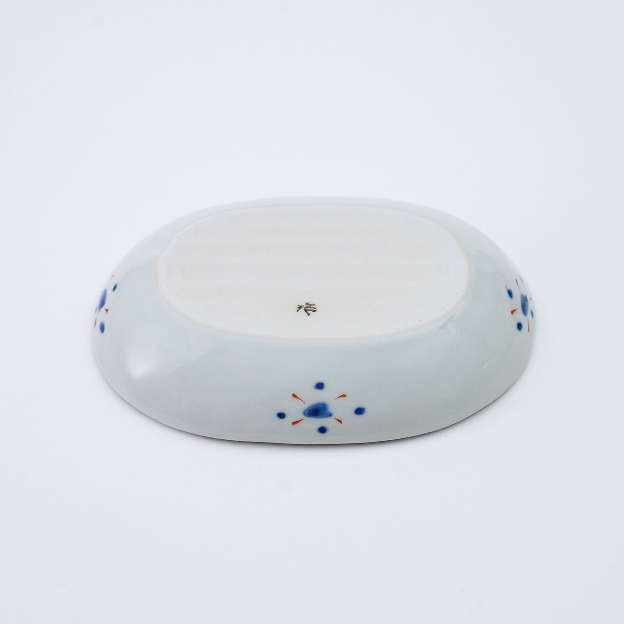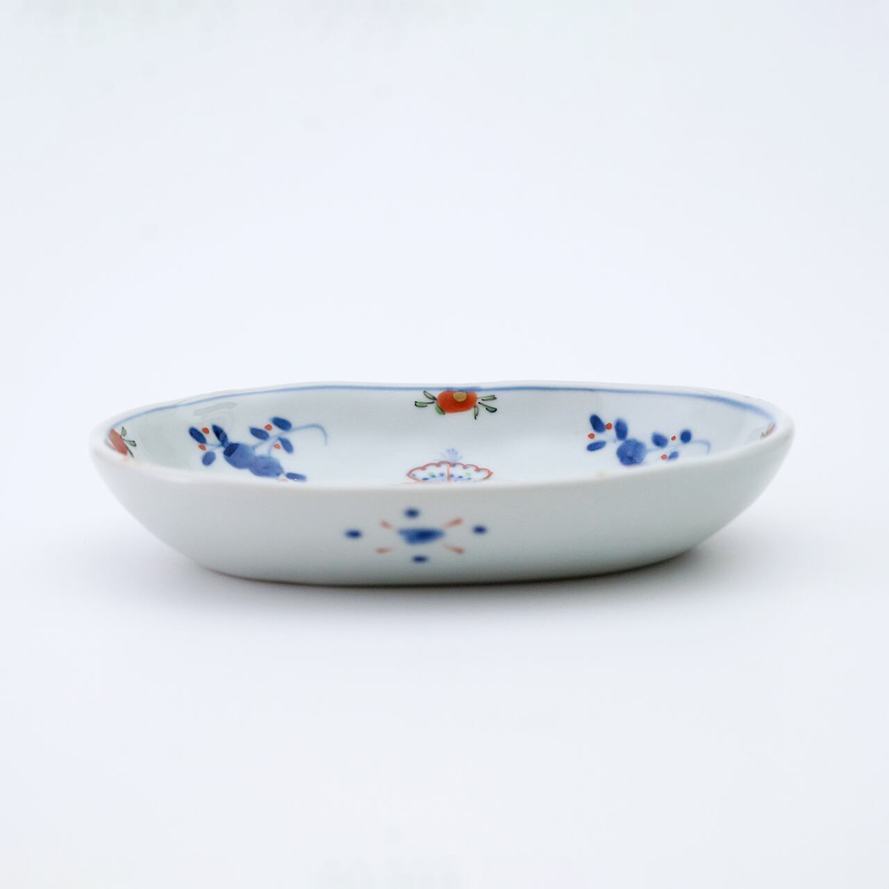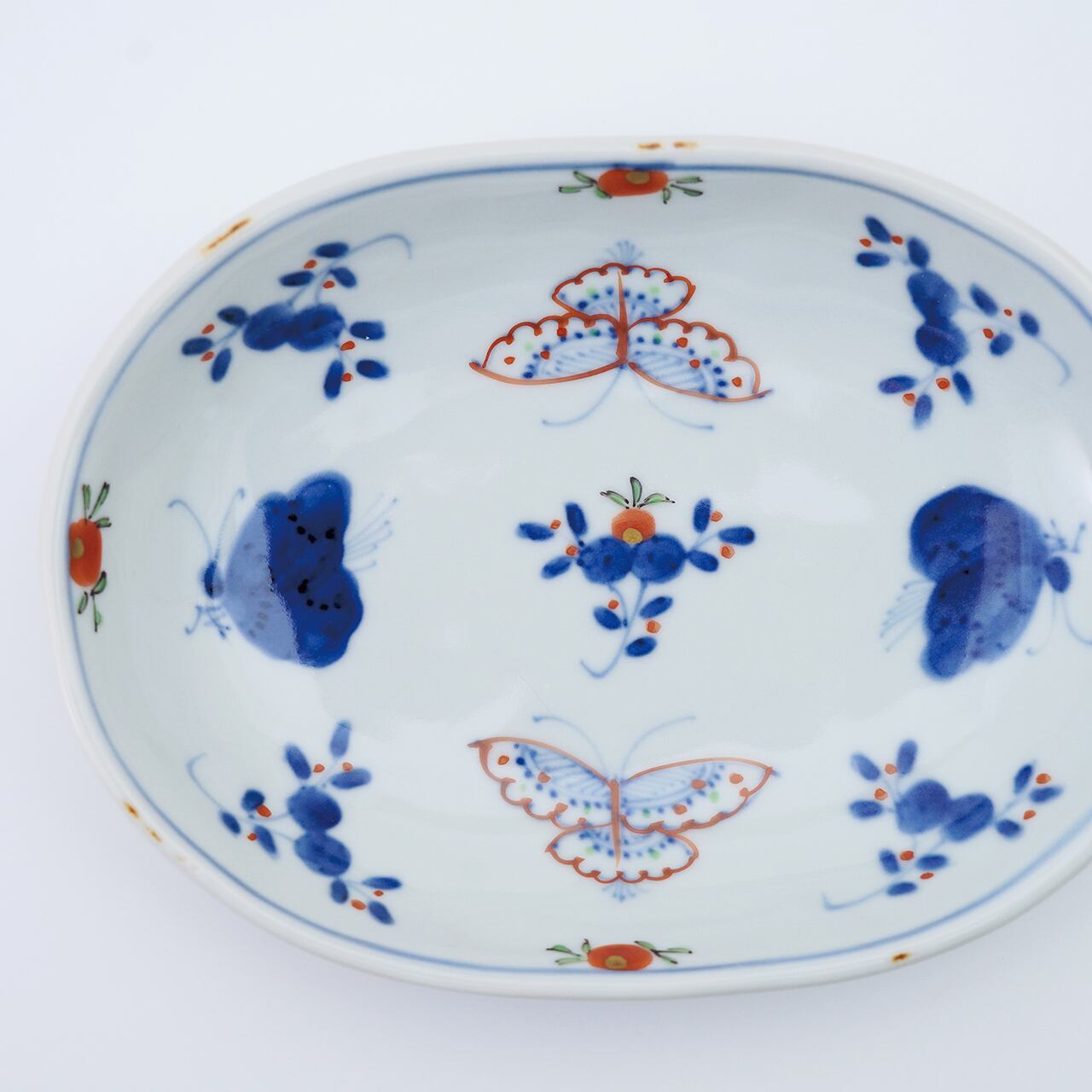 有田焼窯元・福珠窯の定番人気シリーズ「天啓赤絵花蝶文」の小判皿です。 中国の明末・天啓時代に焼かれた赤絵のやきものに倣い1983年から製作されている絵柄です。30年以上たった今でも非常に人気の高いシリーズです。
