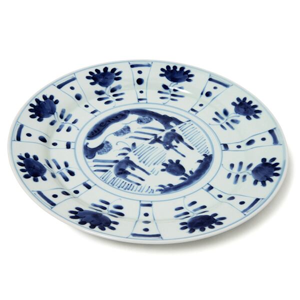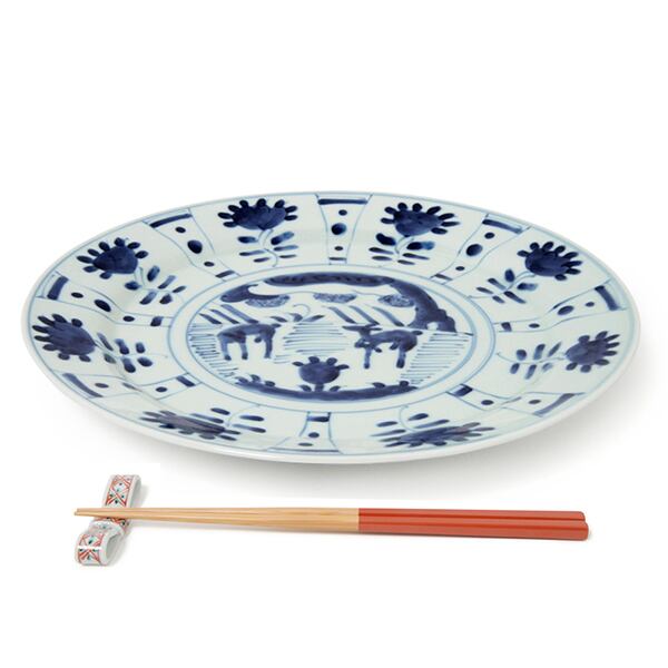 芙蓉手と呼ばれる放射状の絵柄の中に2匹の鹿を描いた人気絵柄「芙蓉手双鹿図」シリーズの段付9寸皿です。