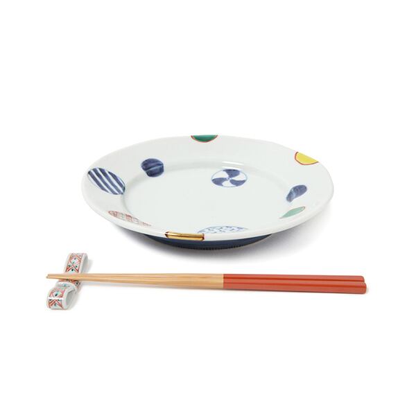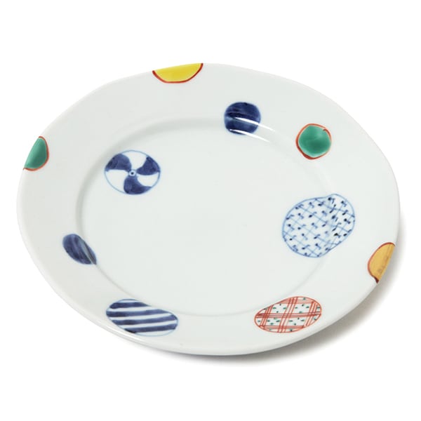 有田焼窯元・福珠窯の定番人気シリーズ「染錦地紋丸紋」の段付5.5寸皿です。 伝統の丸紋をモダンにレイアウトし、製造開始から30年以上たった今でも非常に人気の高いシリーズです。