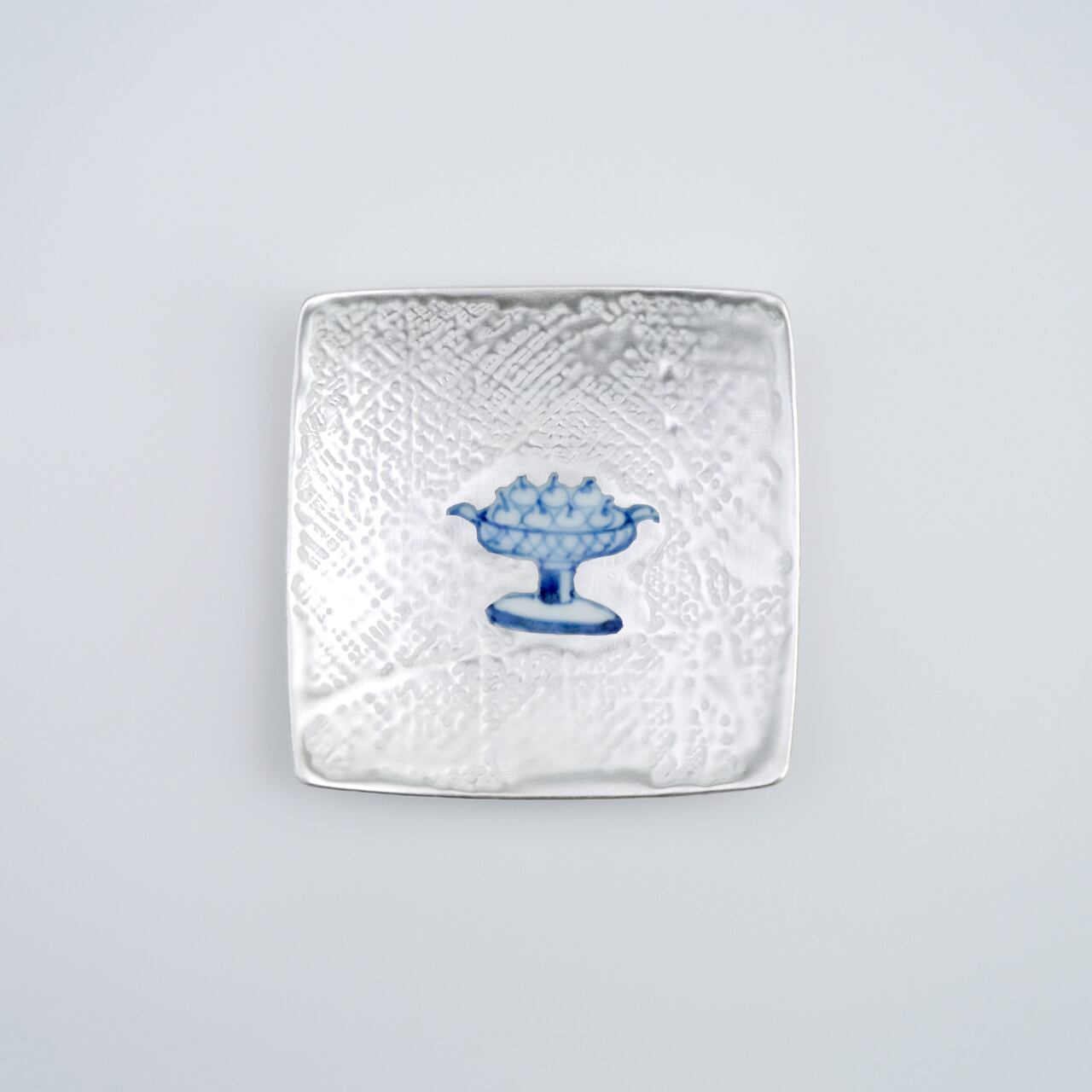 身近にある道具たちをモチーフにしたユニークな絵柄の小皿です。絵柄は染付であしらい、その周りを銀彩で仕上げてあります。お茶菓子などを乗せる小皿としてだけでなく、小物やアクセサリーなどの置き皿にもお使いいただけます。