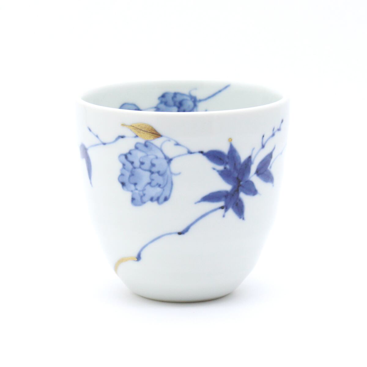 染付で描かれたバラ絵に金彩を施したエレガントで上品な人気絵柄「金彩ばら絵」のべた底湯呑です。湯呑としてだけでなく焼酎カップなどの酒器にもお使いいただけます。