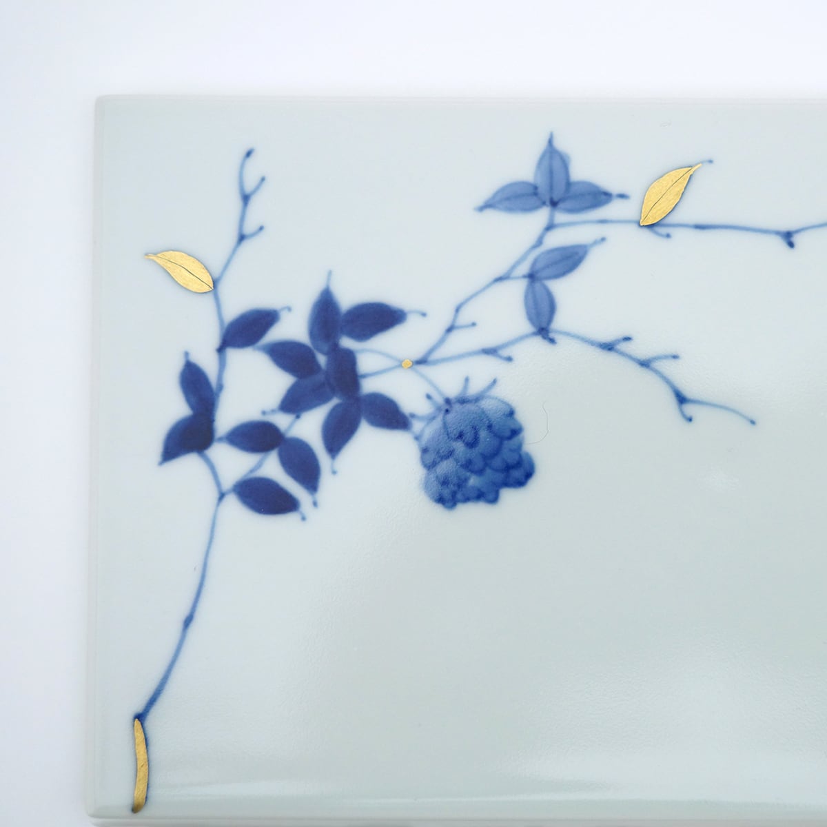 染付で描かれたバラ絵に金彩を施したエレガントで上品な人気絵柄「金彩ばら絵」シリーズの長角皿です。 和食だけでなくフレンチ、イタリアンなどの洋食にもよく合うシリーズです。
